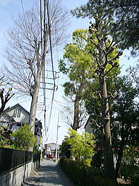 | 左の写真は4月24日撮影、右は5月15日撮影です。道を挟んでケヤキが並んでいますが、芽吹く時期は1週間ぐらい差があります。 芽吹くのが早いか遅いかは、いろいろな条件で差ができるようです。 一般的に乾燥している方が遅い芽吹きになるようです。こちらの場合は、左のケヤキは根が道路へ出ていて根が少々傷ついています。そのせいもあるかもしれませんが、この2本比べてみると右の方が左に負けています。左のケヤキの葉が茂ってくると、日陰になってしまうのです。右のケヤキはお隣が葉を出さないうちに少しでも早く葉を出して稼いでおこうと地道な努力をしているようです。(苗) |